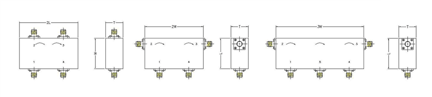 Multi-port Isolators & Circulators are available in all the frequecy ranges. High isolation is obtained by combining 2 or more junctions into a single package. Load termination can be substituted for any of the connectors in the above drawings.